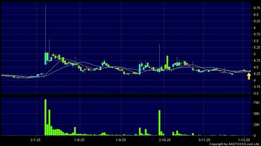 中國春來(01969.HK) 0.000 (0.000%) 沽空 $1.30萬; 比率 0.887% 10天移動平均線升穿20天移動平均線,出現黃金交叉。現價報4.360,無升跌,成交量5.20萬股,成交額22.57萬。