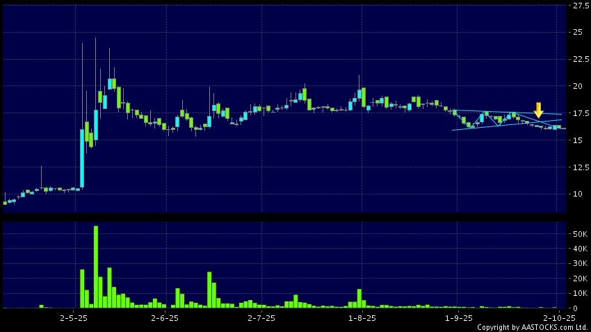 三角形向下突破是指股價的波幅漸漸收窄,在圖表上形成三角形般的狀態。股價在三角形的末端向下突破,下跌趨勢形成,技術走勢偏軟。(港股報價延遲最少十五分鐘。)