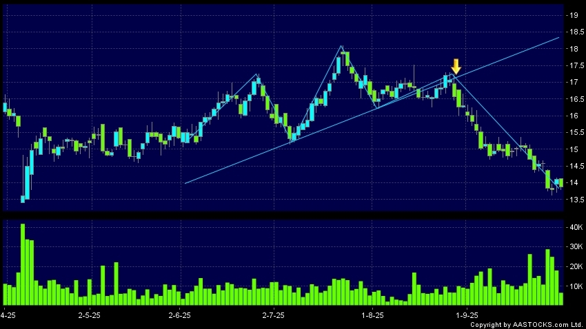 濰柴動力(02338.HK) +0.010 (+0.070%) 沽空 $1.25千萬; 比率 9.418% 呈現頭肩頂向下突破。現價報13.860,下跌1.702%,成交量7.01百萬股,成交額9.73千萬。