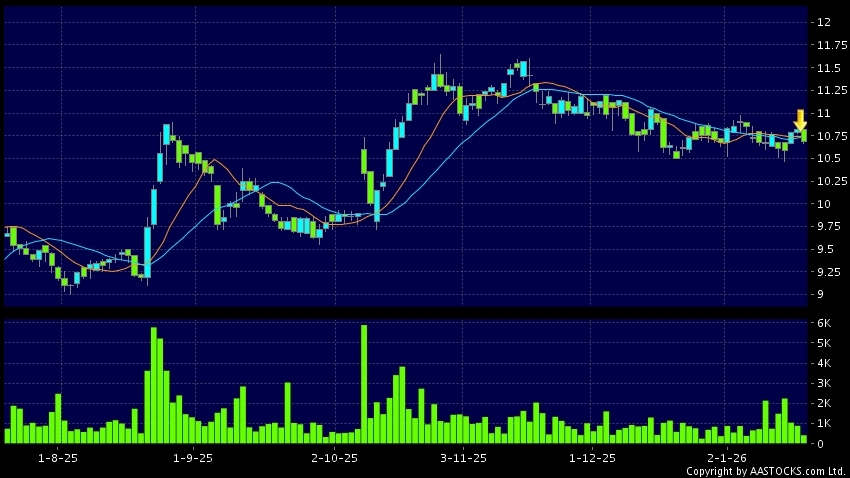 大新銀行集團(02356.HK) -0.110 (-0.978%) 沽空 $90.86萬; 比率 10.347% 10天移動平均線跌穿20天移動平均線,出現死亡交叉。現價報10.690,下跌1.201%,成交量41.28萬股,成交額4.42百萬。