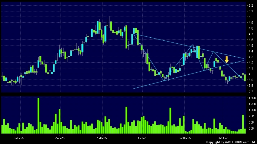 三角形向下突破是指股價的波幅漸漸收窄,在圖表上形成三角形般的狀態。股價在三角形的末端向下突破,下跌趨勢形成,技術走勢偏軟。(港股報價延遲最少十五分鐘。沽空資料截至 2025-12-12 16:25。)