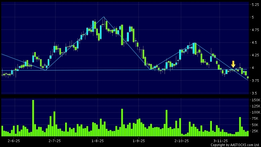 中航科工(02357.HK) +0.090 (+2.320%) 沽空 $1.33千萬; 比率 17.915% 呈現頭肩頂向下突破。現價報3.800,下跌1.299%,成交量2.51千萬股,成交額9.47千萬。