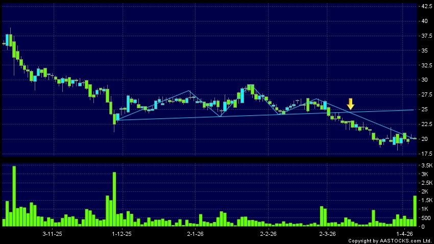 頭肩頂是典型的沽出訊號,當股價跌穿支持線(頸線)時,跌勢確認股價將持續下跌,技術走勢偏軟。(港股報價延遲最少十五分鐘。沽空資料截至 2026-04-14 16:25。)