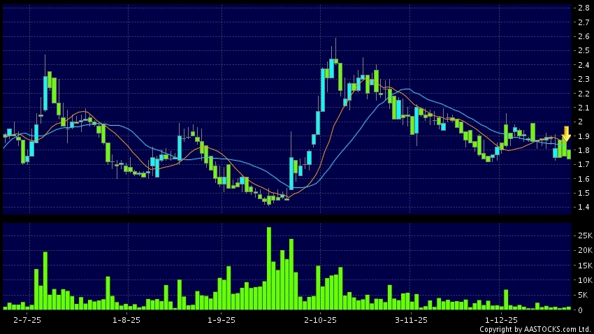 百果園集團(02411.HK) -0.010 (-0.578%) 沽空 $5.66萬; 比率 6.227% 10天移動平均線跌穿20天移動平均線,出現死亡交叉。現價報1.740,下跌1.136%,成交量1.10百萬股,成交額1.95百萬。