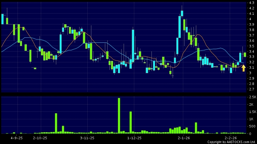 子不語(02420.HK) -0.020 (-0.491%) 10天移動平均線升穿20天移動平均線,出現黃金交叉。現價報3.280,下跌2.090%,成交量4.00萬股,成交額13.37萬。