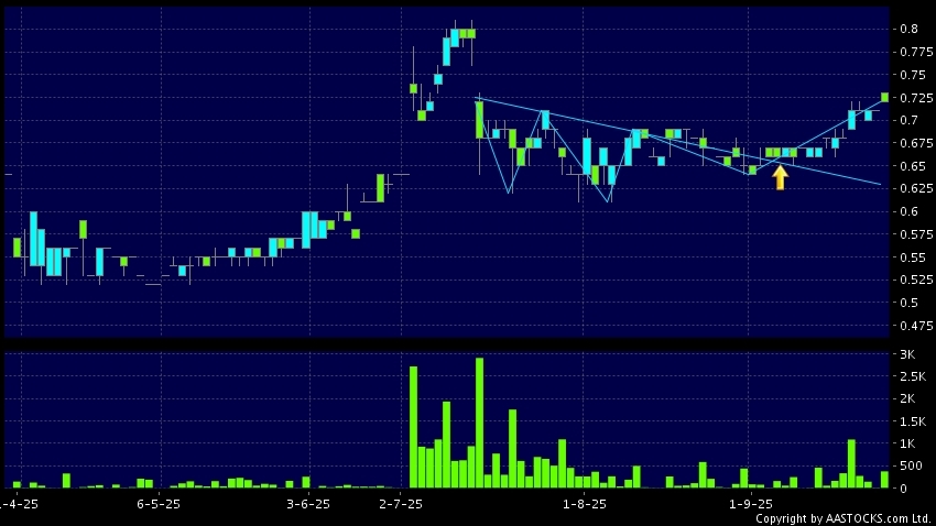 潤華服務(02455.HK) 0.000 (0.000%) 呈現頭肩底向上突破,股價升穿頸線。現價報0.720,上升1.408%,成交量37.40萬股,成交額26.97萬。