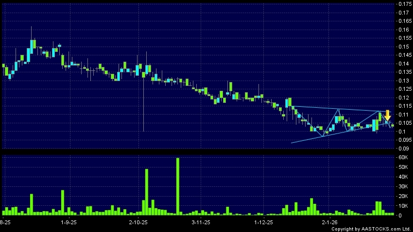 昇能集團(02459.HK) 0.000 (0.000%) 呈現三角形向下突破。現價報0.103,下跌2.830%,成交量2.73百萬股,成交額28.35萬。