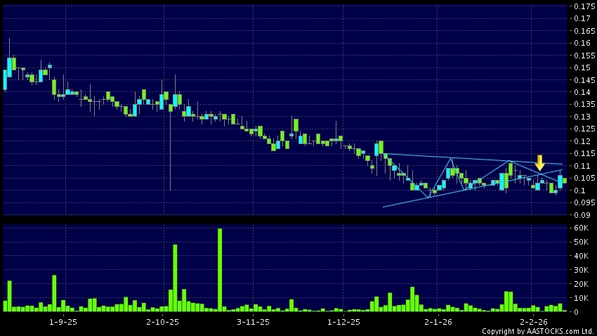 昇能集團(02459.HK) 0.000 (0.000%) 呈現三角形向下突破。現價報0.104,下跌1.887%,成交量1.16百萬股,成交額12.09萬。