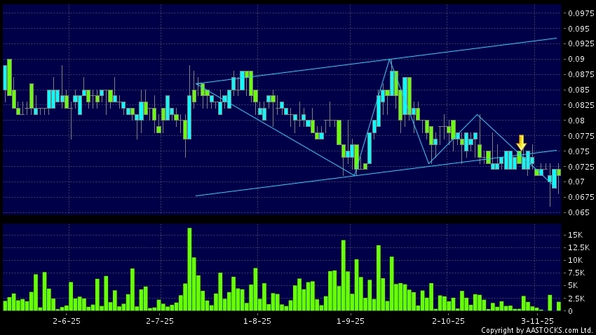 中梁控股(02772.HK) +0.001 (+1.471%) 呈現區域下軌突破。現價報0.071,下跌1.389%,成交量1.88百萬股,成交額12.91萬。
