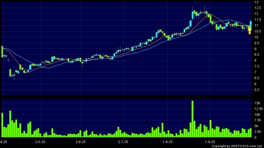 聯想控股(03396.HK) -0.430 (-4.279%) 沽空 $3.13百萬; 比率 9.378% 10天移動平均線升穿20天移動平均線,出現黃金交叉。現價報11.390,上升6.151%,成交量4.14百萬股,成交額4.64千萬。