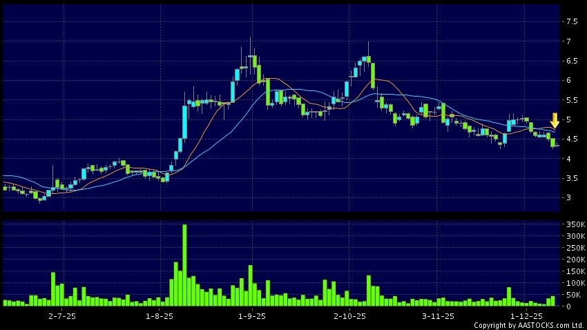 阜博集團(03738.HK) +0.240 (+5.769%) 沽空 $1.52千萬; 比率 8.536% 10天移動平均線跌穿20天移動平均線,出現死亡交叉。現價報4.300,下跌0.232%,成交量2.42百萬股,成交額1.05千萬。