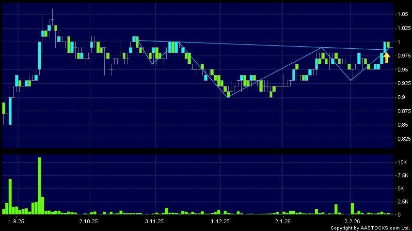 明輝國際(03828.HK) -0.020 (-2.105%) 呈現頭肩底向上突破,股價升穿頸線。現價報0.990,無升跌,成交量13.90萬股,成交額13.76萬。