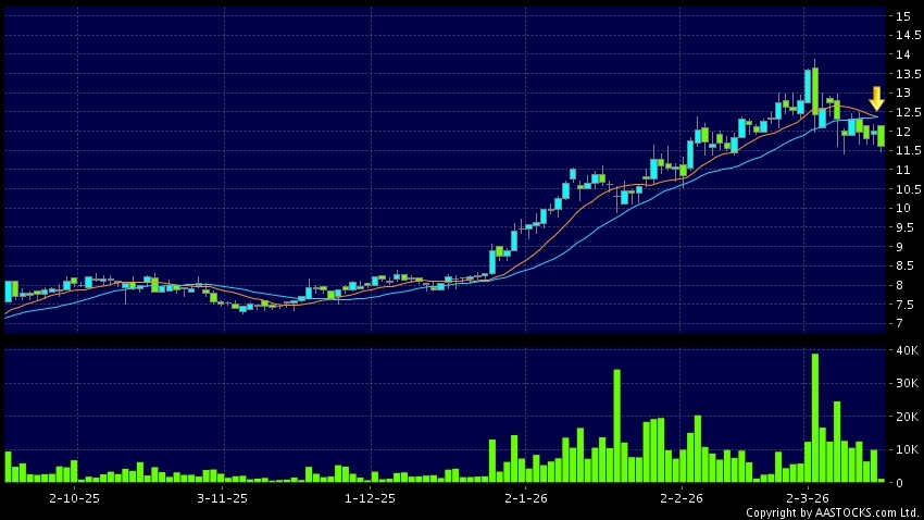 中集安瑞科(03899.HK) +0.340 (+2.874%) 沽空 $4.30千萬; 比率 32.858% 10天移動平均線跌穿20天移動平均線,出現死亡交叉。現價報11.550,下跌3.830%,成交量1.19百萬股,成交額1.39千萬。