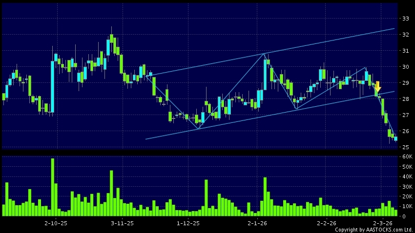 區域突破指股價在過去的一段時間只在一個範圍在內活動,然後股價下跌作出突破,跌穿區域的底部,技術走勢偏軟。(港股報價延遲最少十五分鐘。沽空資料截至 2026-03-10 16:25。)