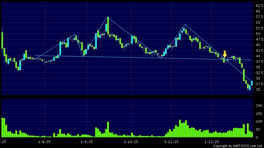 頭肩頂是典型的沽出訊號,當股價跌穿支持線(頸線)時,跌勢確認股價將持續下跌,技術走勢偏軟。(港股報價延遲最少十五分鐘。沽空資料截至 2026-01-26 16:25。)