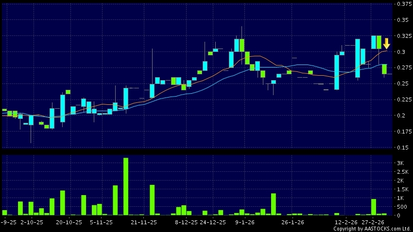 泰林科建(06193.HK) -0.010 (-3.448%) 10天移動平均線跌穿20天移動平均線,出現死亡交叉。現價報0.265,無升跌,成交量0.00股,成交額0.00。