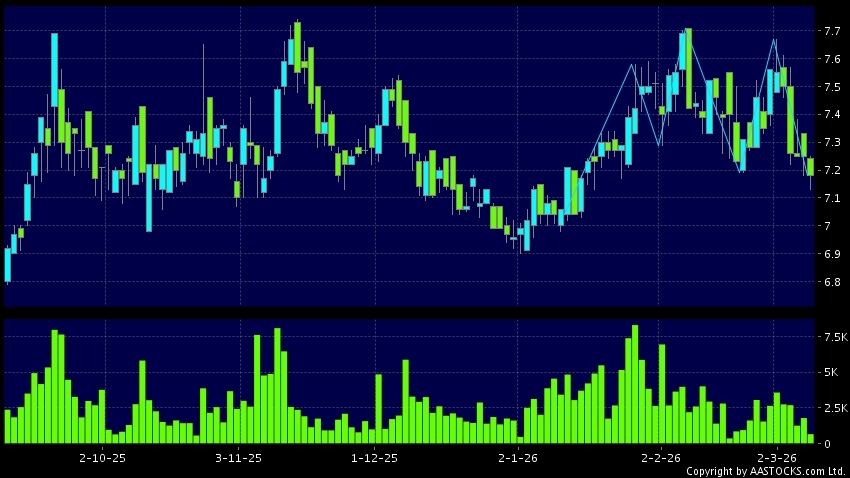 青島港(06198.HK) -0.230 (-3.104%) 沽空 $33.36萬; 比率 1.848% 呈現三重頂突破向下。現價報7.200,下跌0.690%,成交量67.90萬股,成交額4.87百萬。