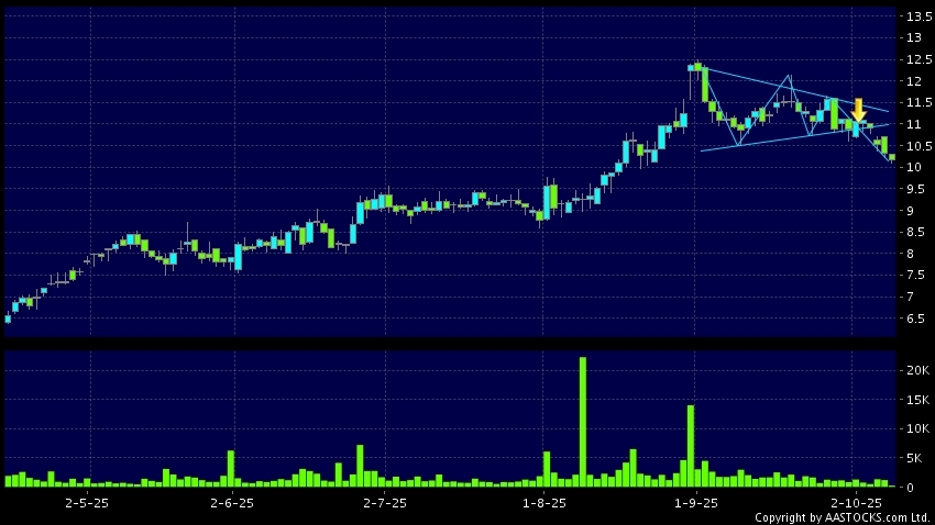 三角形向下突破是指股價的波幅漸漸收窄,在圖表上形成三角形般的狀態。股價在三角形的末端向下突破,下跌趨勢形成,技術走勢偏軟。(港股報價延遲最少十五分鐘。沽空資料截至 2025-11-07 16:25。)