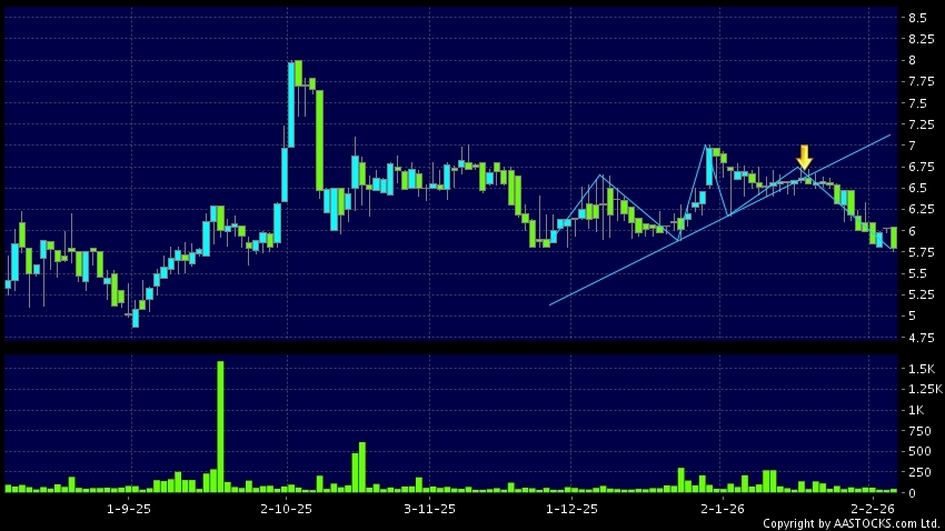頭肩頂是典型的沽出訊號,當股價跌穿支持線(頸線)時,跌勢確認股價將持續下跌,技術走勢偏軟。(港股報價延遲最少十五分鐘。)