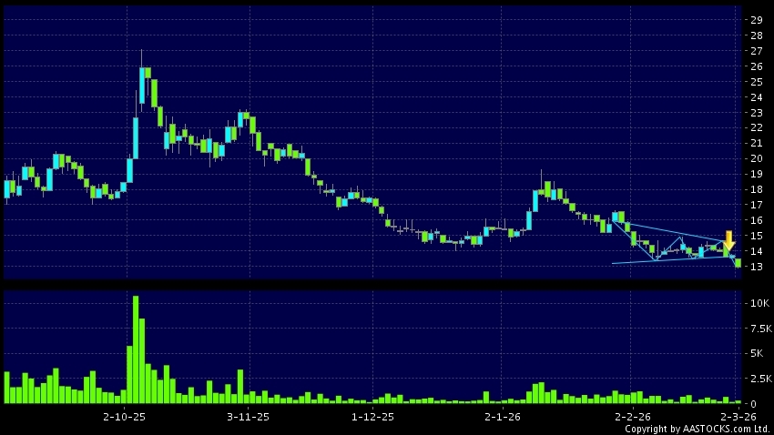 三角形向下突破是指股價的波幅漸漸收窄,在圖表上形成三角形般的狀態。股價在三角形的末端向下突破,下跌趨勢形成,技術走勢偏軟。(港股報價延遲最少十五分鐘。沽空資料截至 2026-04-01 16:25。)