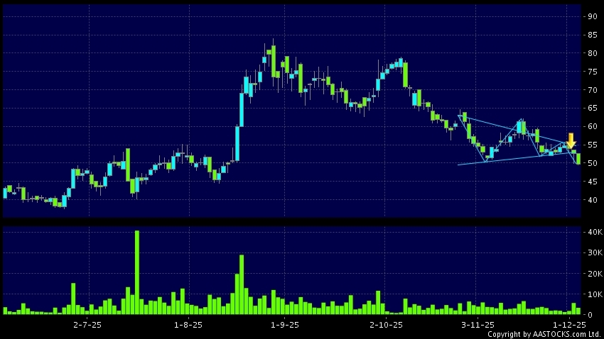 三角形向下突破是指股價的波幅漸漸收窄,在圖表上形成三角形般的狀態。股價在三角形的末端向下突破,下跌趨勢形成,技術走勢偏軟。(港股報價延遲最少十五分鐘。沽空資料截至 2025-12-05 16:25。)
