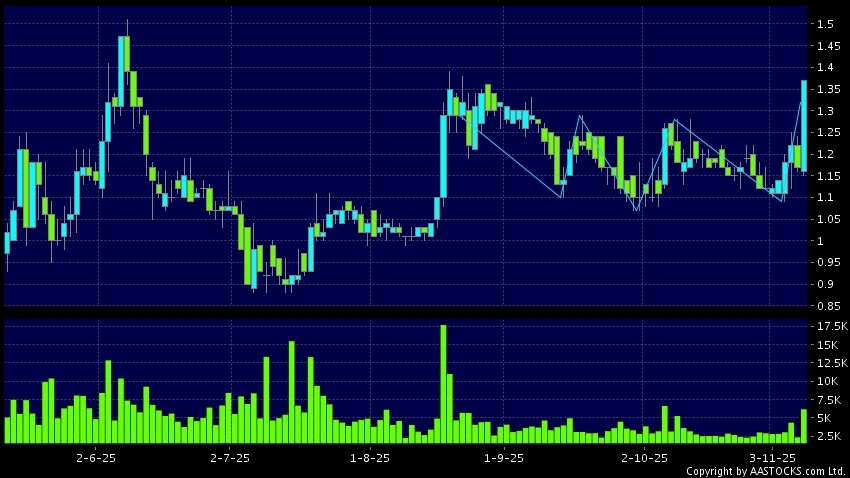 榮利營造(09639.HK) -0.050 (-3.906%) 呈現三重底突破向上。現價報1.350,上升15.385%,成交量6.38百萬股,成交額8.09百萬。