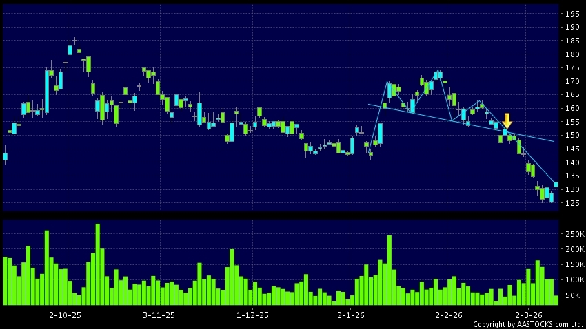 頭肩頂是典型的沽出訊號,當股價跌穿支持線(頸線)時,跌勢確認股價將持續下跌,技術走勢偏軟。(港股報價延遲最少十五分鐘。沽空資料截至 2026-03-10 16:25。)