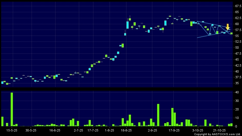 三角形向下突破是指股價的波幅漸漸收窄,在圖表上形成三角形般的狀態。股價在三角形的末端向下突破,下跌趨勢形成,技術走勢偏軟。(港股報價延遲最少十五分鐘。)