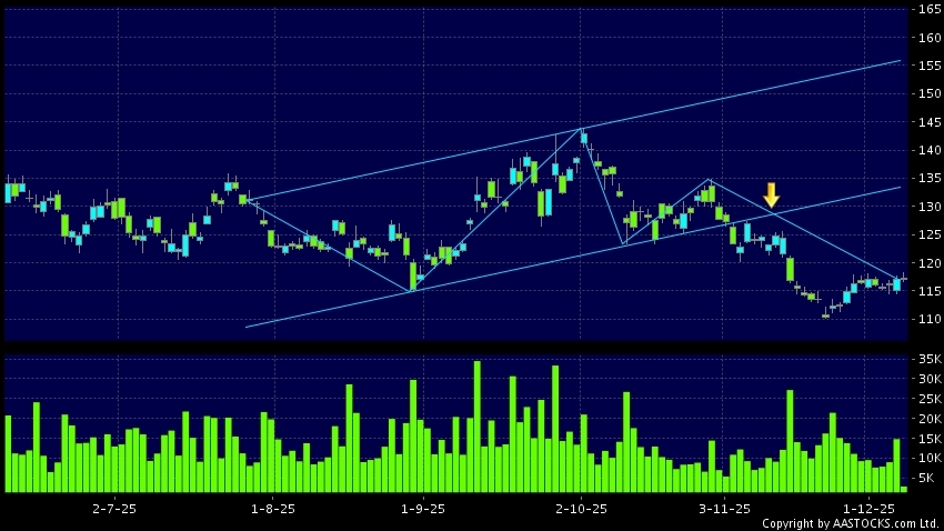 區域突破指股價在過去的一段時間只在一個範圍在內活動,然後股價下跌作出突破,跌穿區域的底部,技術走勢偏軟。(港股報價延遲最少十五分鐘。沽空資料截至 2025-12-08 16:25。)