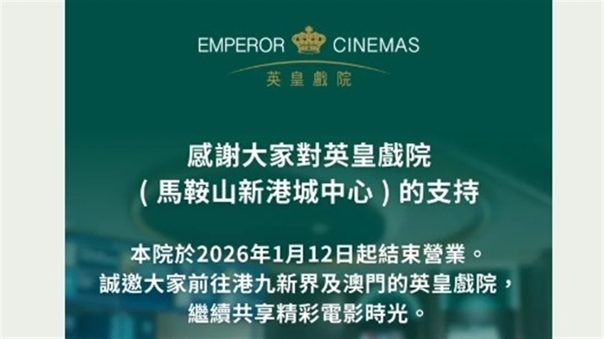 英皇戲院宣布,馬鞍山新港城中心英皇戲院於今日(12日)即時結束營業。新港城中心英皇戲院為區內唯一戲院,此前已有網民發現戲院無預售今日起的場次戲票,售票員工解釋是由於尚未出「排片」,但不清楚是否即將會結業。(mn/u)