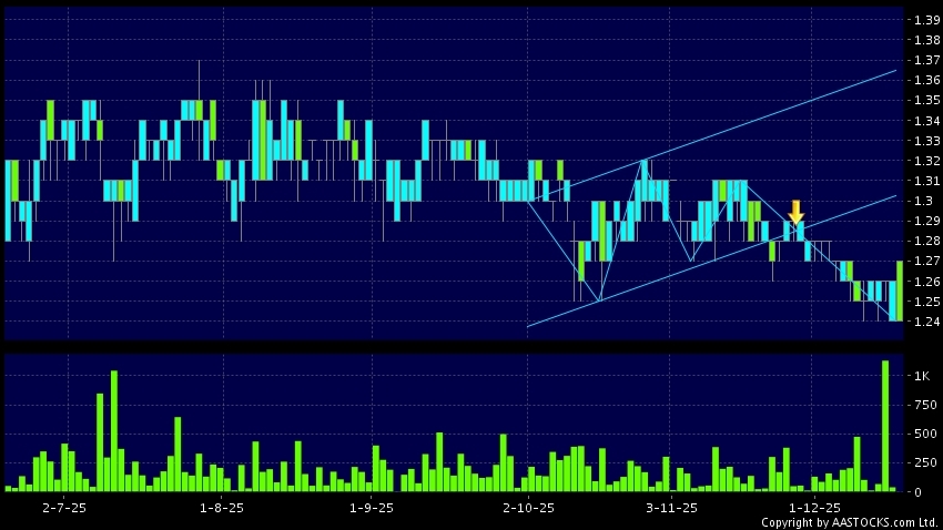 CHINESE EST H(00127.HK)  0.000 (0.000%)   appears a downside range breakout. Last printed at 1.240; fell 1.587%; on volume of 1.50K shares and turnover of $1.89K