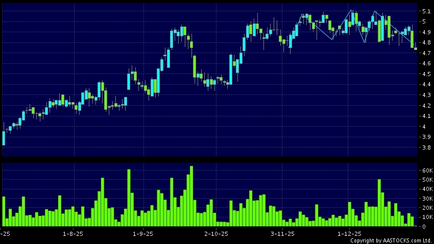 Disclaimer:The information, financial market data, quotes, charts, statistics and / or various technical analysis indicators are automatically generated based on the analyses and interpretations of publicly available information and should be used as references only at your own discretion. Such automatically generated content does not reflect the views or opinions of AASTOCKS.com Limited nor does AASTOCKS.com Limited make any guarantees to their accuracy, completeness, timeliness or correctness. You are advised to consult independent professional advice to verify pricing information or to obtain more detailed market information. Any uses of information or trades executed following the said automatically generated content are taken at your own risk for your own account.