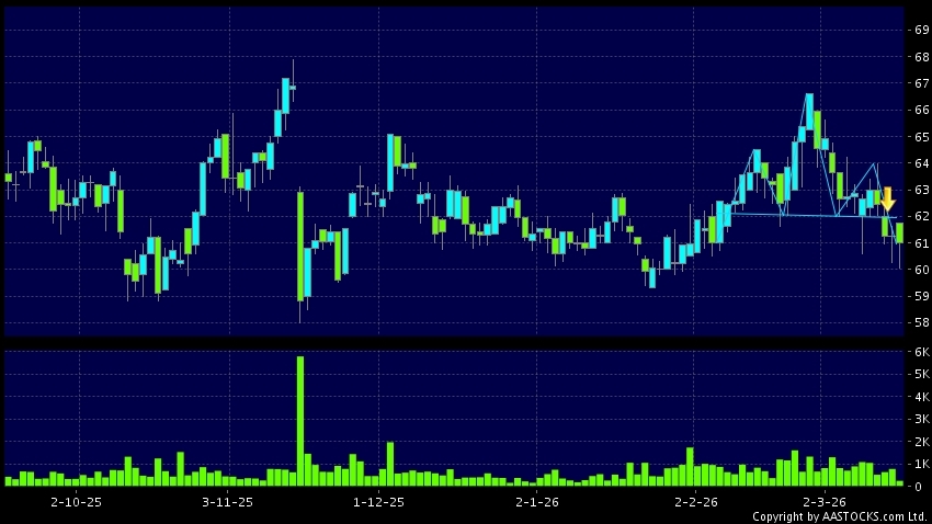 VTECH HOLDINGS(00303.HK) appears a downside breakout, dropped below the neckline. Last printed at 61.000; fell 0.408%; on volume of 242.50K shares and turnover of $14.70MRecent Per...