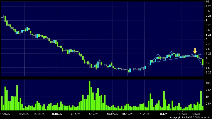 Head Shoulders top is a typical bearish signal, when stock price breaks the supportive level, downtrend would possibly start.(HK stocks quote is delayed for at least 15 mins.Short Selling Data as at 2026-03-13 16:25.)