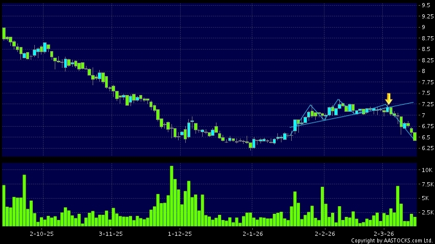 Head Shoulders top is a typical bearish signal, when stock price breaks the supportive level, downtrend would possibly start.(HK stocks quote is delayed for at least 15 mins.Short Selling Data as at 2026-03-13 16:25.)