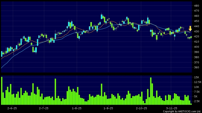 HKEX(00388.HK)'s SMA 10 crosses below SMA 20, which is a death cross. Last printed at 417.200; rose 0.192%; on volume of 1.36M shares and turnover of $568.76MRecent PerformanceIn 3...