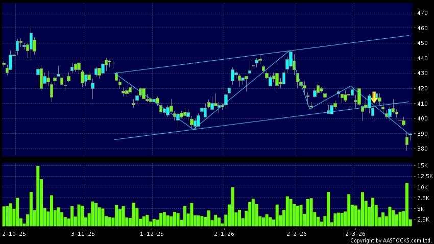 HKEX(00388.HK)  +9.000 (+2.352%)    Short selling $375.18M; Ratio 17.719%   appears a downside range breakout. Last printed at 389.800; rose 1.882%; on volume of 2.50M shares and turnover of $970.52M