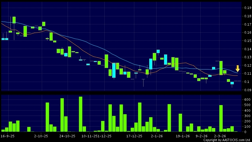 TIANDA PHARMA(00455.HK)'s SMA 10 crosses below SMA 20, which is a death cross. Last printed at 0.101; Flattish; on volume of 0.00 shares and turnover of $0.00Recent PerformanceIn 3...