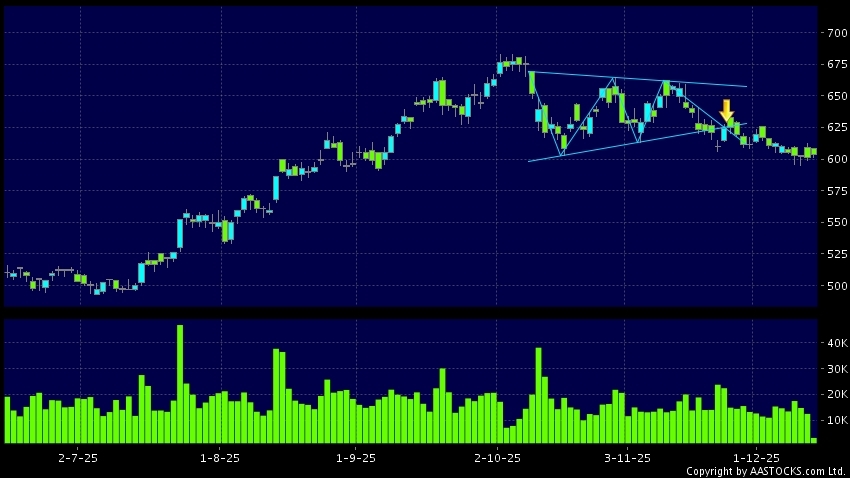Triangle Breakout means the volatility of price movement is decreasing, stock price finally broke the bottom of triangle. A downward trend will start.(HK stocks quote is delayed for at least 15 mins.Short Selling Data as at 2025-12-12 12:25.)