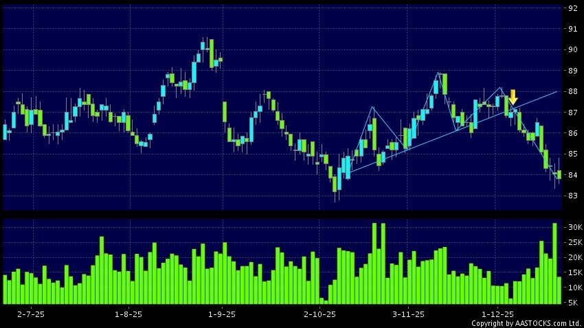 Head Shoulders top is a typical bearish signal, when stock price breaks the supportive level, downtrend would possibly start.(HK stocks quote is delayed for at least 15 mins.Short Selling Data as at 2025-12-23 16:25.)