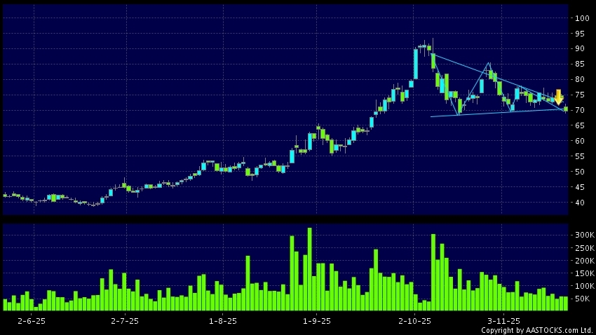 SMIC(00981.HK)  -4.700 (-6.395%)    Short selling $404.67M; Ratio 5.368%   shows a triangle breakout. Last printed at 69.600; fell 5.306%; on volume of 58.32M shares and turnover of $4.10B