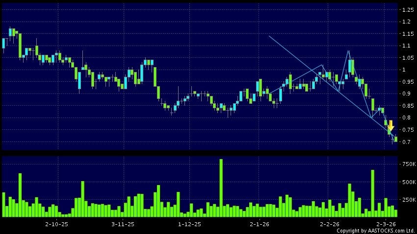 DAMAI ENT(01060.HK) appears a downside breakout, dropped below the neckline. Last printed at 0.700; fell 1.408%; on volume of 106.76M shares and turnover of $75.52MRecent Performan...