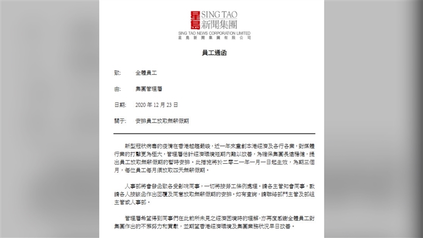 SING TAO (01105.HK) is mounting provisional no-pay leave arrangements on employees, according to an internal letter from executives. The arrangement will be effective for three mon...
