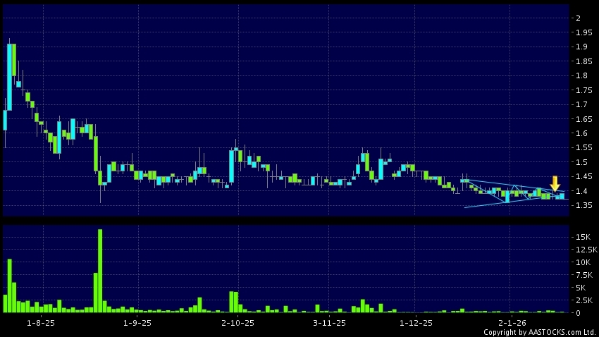 Triangle Breakout means the volatility of price movement is decreasing, stock price finally broke the bottom of triangle. A downward trend will start.(HK stocks quote is delayed for at least 15 mins.)