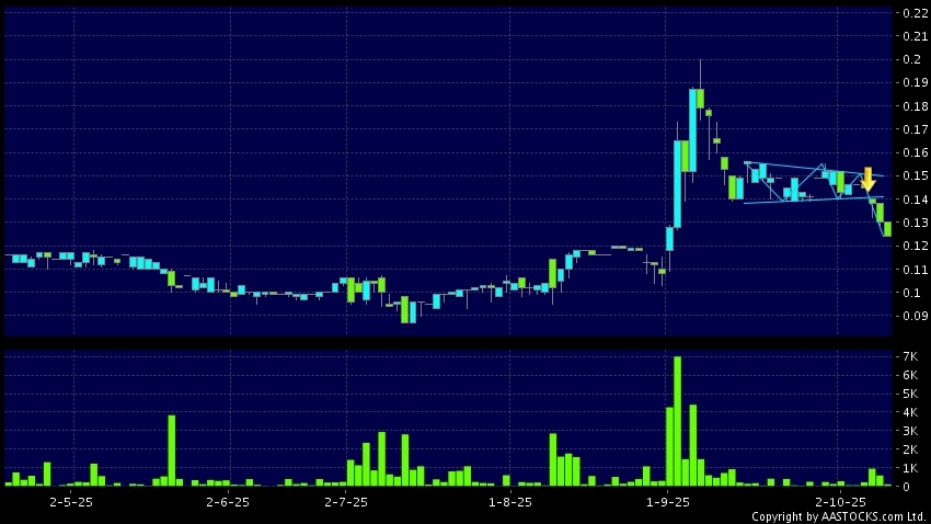 Triangle Breakout means the volatility of price movement is decreasing, stock price finally broke the bottom of triangle. A downward trend will start.(HK stocks quote is delayed for at least 15 mins.)