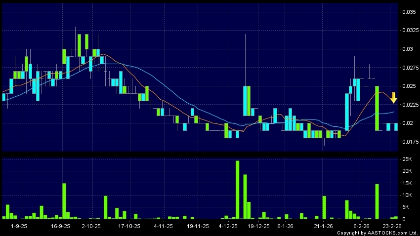 KINGWELL GROUP(01195.HK)  0.000 (0.000%)   's SMA 10 crosses below SMA 20, which is a death cross. Last printed at 0.020; Flattish; on volume of 1.14M shares and turnover of $22.77K