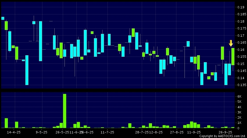 HUASHENG INTL(01323.HK)  -0.001 (-0.662%)   shows a trend reversal. Last printed at 0.149; fell 0.667%; on volume of 180.00K shares and turnover of $27.28K