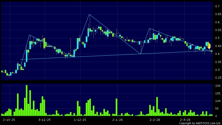 ACME INTL HLDGS(01870.HK) appears a downside breakout, dropped below the neckline. Last printed at 0.415; fell 7.778%; on volume of 1.04M shares and turnover of $428.66KRecent Perf...