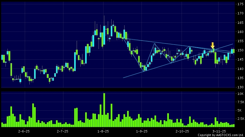 Triangle Breakout means the volatility of price movement is decreasing, stock price finally broke the bottom of triangle. A downward trend will start.(HK stocks quote is delayed for at least 15 mins.Short Selling Data as at 2025-11-20 16:25.)