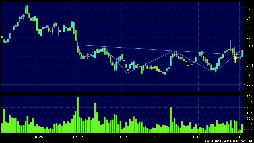 MENGNIU DAIRY(02319.HK) appears an upside breakout, rose above the neckline. Last printed at 15.320; rose 2.612%; on volume of 20.54M shares and turnover of $313.76MRecent Performa...